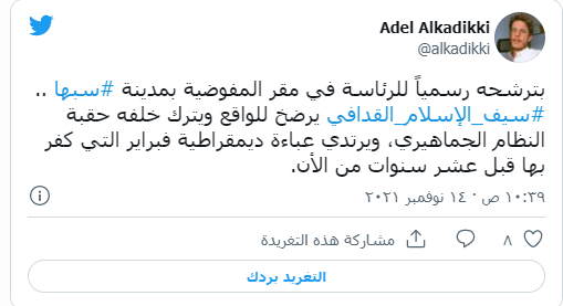 وأوضح لوكالة الأنباء الفرنسية "حقيقة أن سيف (الإسلام) يترشح الآن لا يمكن إلا أن يزيد من هشاشة المشروع الانتخابي، والارتباك في الوضع القائم".