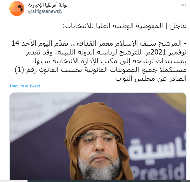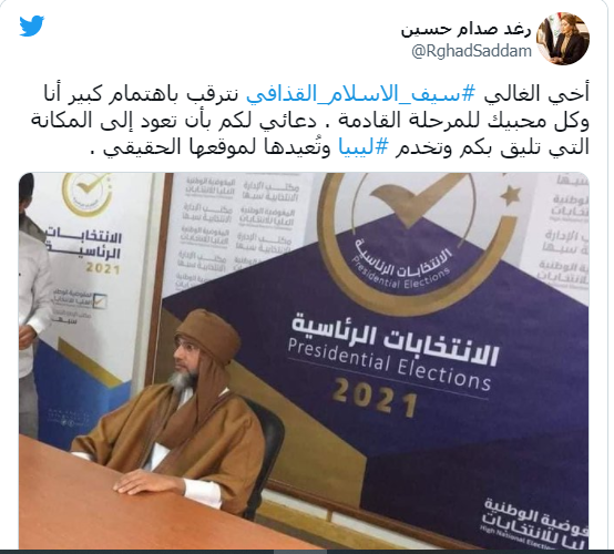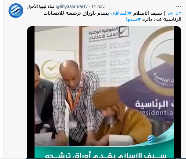 وكانت المفوضية قد أعلنت في وقت سابق ببيان صحافي أن نجل معمر القذافي ، قدّم "أوراق الترشح لرئاسة الدولة وتقدّم بالمستندات المطلوبة إلى مكتب الإدارة الانتخابية في سبها (في جنوب البلاد)، مستكملا المسوغات القانونية".كما أعلنت في بيان أنه استلم بطاقته الانتخابية من المركز الانتخابي المسجل به في سبها.