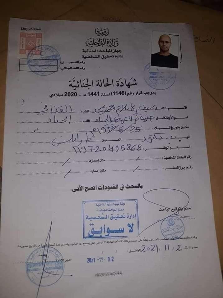 إلا أن صورة للسجل العدلي لنجل القذافي حديثة الصدور، أظهرت عبارة "لا سوابق"، ويبدو أنها الوثيقة التي استند فيها سيف الإسلام لإيداع ملف ترشحه لانتخابات الرئاسة الليبيبة.