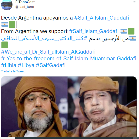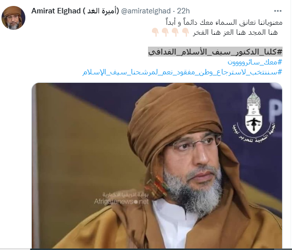 و قد تداول عدد من مغردي موقع «تويتر»، هاشتاج " #كلنا_الدكتور_سيف_الأسلام_القدافي " ، بعدما أصدرت المفوضية العليا للانتخابات في ليبيا، استبعاد سيف الاسلام  القذافي من الترشح للانتخابات الرئاسية في البلاد.
