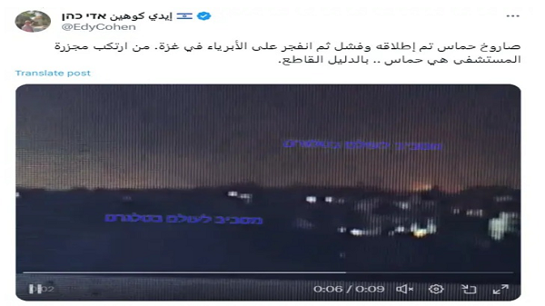 في الأثناء تم حذف مقطع الفيديو المزيف من حساب رسمي يدعى@Israel والذي يدعي أنه يظهر صاروخاً لحماس يضرب المستشفى المعمداني في غزة.