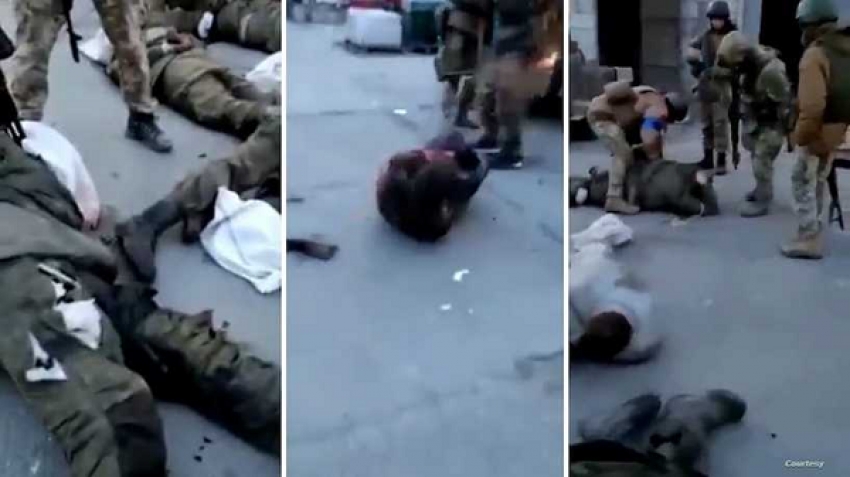 لمشاهد تمت نسبتها لجنود أوكرانيين يقومون بإطلاق النار بشكل مباشر تجاه أقدام جنود أسرى روس من مسافة قصيرة جدا.