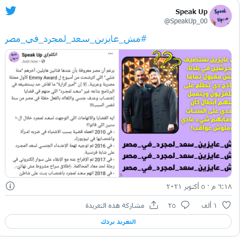 وقبل ذلك بسنة، أطلق وسم "مش عايزين سعد لمجرد في مصر" حين أعلن عن حفل له هناك.