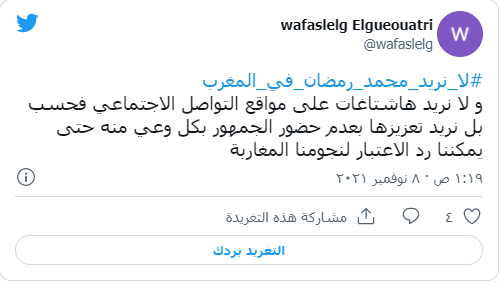 ومن بين التعليقات: "#لا_نريد_محمد_رمضان_في_المغرب وانتهى الكلام"، "#لا_نريد_محمد_رمضان_في_المغرب كما تدين تدان"، "#لا_نريد_محمد_رمضان_في_المغرب ولا في مصر".