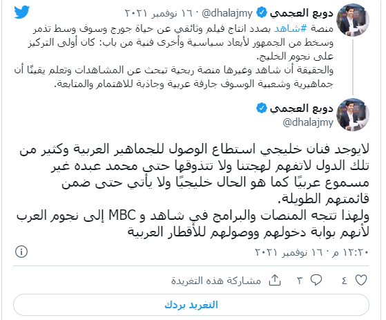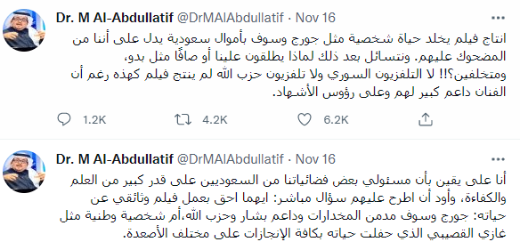 ونشر عدد من المؤثرين والإعلاميين السعوديين فيديوهات انتقدت إدارة “أم بي سي” ومديرها التنفيذي اللبناني علي الجابر، التي انتقدت إنفاق القناة ميزانية ضخمة لإنتاج عمل عن سلطان الطرب، رغم مواقفه الممجدة علنا لحزب الله ولأمينه العام حسن نصر الله والرئيس السوري بشار الأسد.
